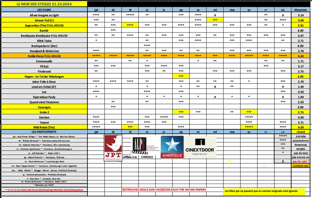 Après un mois de silence abasourdissant, les HATARI PAPERS reviennent doucement mais sûrement, suite à une réparation du Mac de la maison. Il se peut qu’il reste encore quelques coins à arrondir et quelques hics à corriger, mais nous revoilou, comme on dit, avec – également – l’essai d’une nouvelle mise en page. Comme vous le savez, nous venons de passer 10 jours au Festival de Gand, où nous nous sommes régalés avec 38 films, dont la plupart sortiront au Luxembourg au cours de prochains mois. Nos deux chouchous gantois à 5 étoiles étaient THE ROOM NEXT DOOR de Pedro Almodovar (Lion d’Or à Venise) et MEMOIRS OF A SNAIL de Adam Elliot, un chef d’oeuvre absolu du cinéma d’animation qui – pas plus tard que ce dimanche – a remporté le Prix du Meilleur Film au prestigieux London Film Festival. Espérons que ces deux joyaux trouvent rapidement le chemin de nos salles.